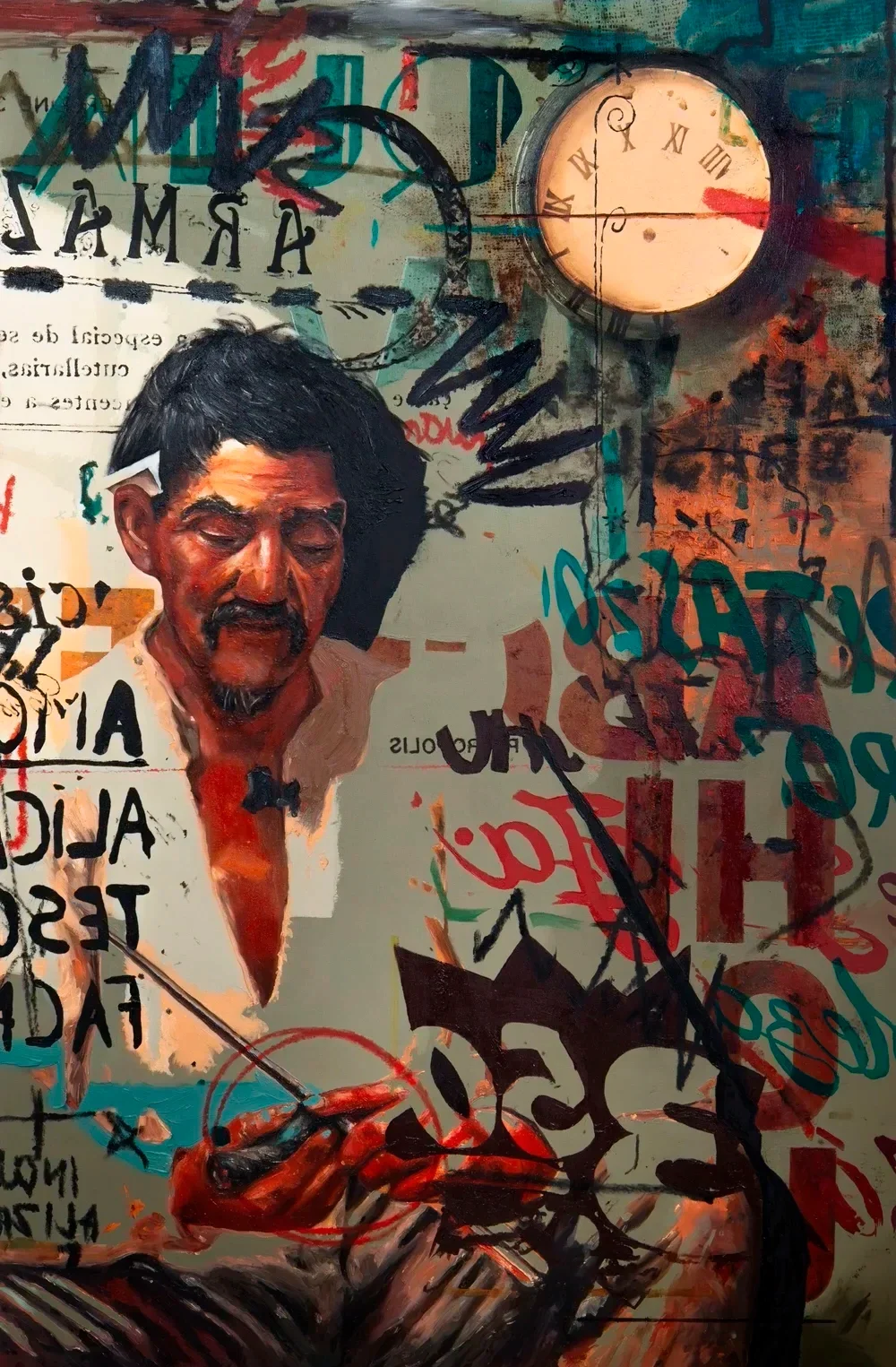 Caipira Picando o Tempo traz para hoje o Caipira Picando Fumo (1893), de Almeida Júnior, relendo essa figura à luz de um mal-estar bem atual: ser arrancado do próprio ritmo por um mundo cada vez mais acelerado. Se, já no fim do século XIX, a modernização predatória começava a empurrar o caipira para fora de seu lugar, aqui ele reaparece na cidade, depois do êxodo, espremido entre fragmentos e acúmulos. A composição carregada tenta traduzir a hiperestimulação e a sobrecarga que marcam a vida do trabalhador urbano — essa sensação sufocante de urgência, tempo comprimido e atenção dispersa. Em contraste, num clarão simbólico, o personagem persiste na lentidão concentrada de seu gesto miúdo, como quem ainda tenta picotar para si, por meio do ritual, uma fração de tempo e, com ela, resguardar a própria dignidade. Desdobramento serigráfico de obra originalmente realizada em óleo sobre linho.